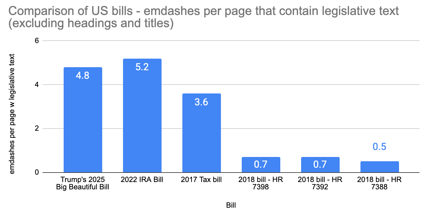 Note #1: A great baseline (at first seeming to disprove my post) is this US tax bill from 2017, which contained an extremely high number of emdashes per page (and for about an hour I had to review Trump’s bill and revisit the emdash use I was searching for). To account for what is most noticeable in Trump’s 2025 bill (and also apparent in the IRA bill from 2022), I’d taken the presumption that (manually) counting only the emdashes inherent in the legislative body of the bill and those not as used in the headings of a section or title was key for an apples to apples comparison (for using emdashes in the body of the legislative text), with non-zero bias but substantially minimized.
